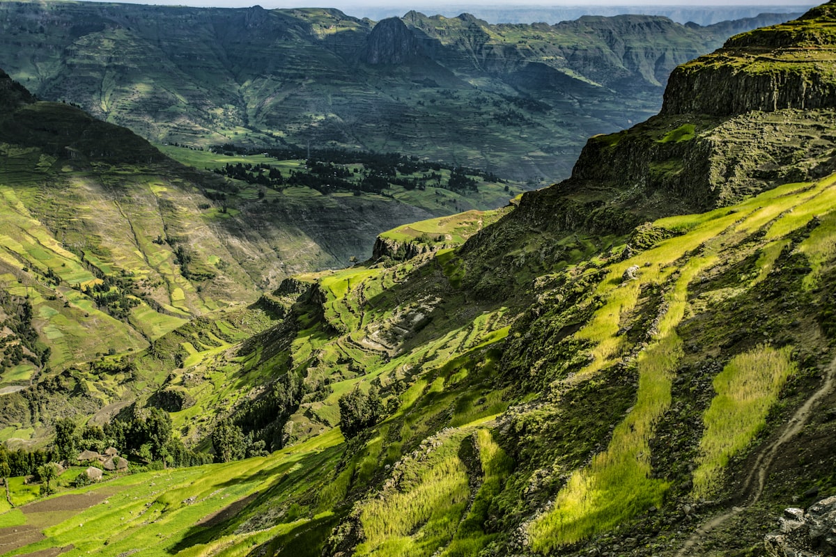 シミエン山脈:標高3,000〜4,000メートル以上。昼間は暖かいけど、夜は0度近くまで下がる。防寒着は必須。雨季は道がぬかるんでトレッキングが大変。